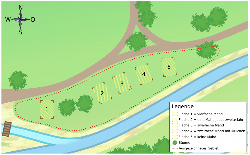 Fläche 1 wird viermal im Jahr gemäht, angelehnt an den Rhythmus einer intensiven Gründlandbewirtschaftung. Auf Fläche 2 erfolgt eine Mahd jedes zweite Jahr mit dem Ziel, die Fläche offenzuhalten und eine Verbuschung zu verhindern. Die Flächen 3 und 4 werden jeweils zweimal im Jahr gemäht. Während das Schnittgut auf Fläche 3 entsprechend einer extensiven Wiesenbewirtschaftung entfernt wird („Mähen mit Abräumen“), verbleibt es auf Fläche 4 an Ort und Stelle („Mulchen“). Fläche 5 wird nicht gemäht und ermöglicht die Beobachtung von Entwicklungen einer Wiese ohne pflegende Eingriffe des Menschen (Grünlandbrache).